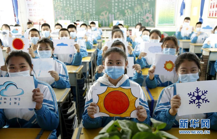 3月23日,河北省邢台市第七中学学生展示气象知识绘画。