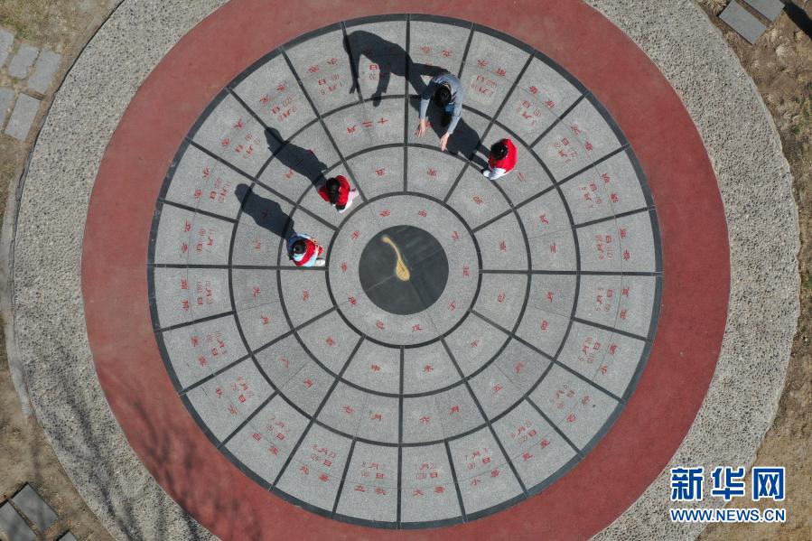 3月23日,河北省唐山市丰南区胥各庄小学的学生在气象主题公园学习气象知识(无人机照片)。