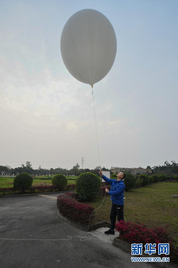 在成都温江国家气候观象台,气象观测工程师陈建将探空气球的线绳延长到一定高度等待放飞(3月16日摄)。