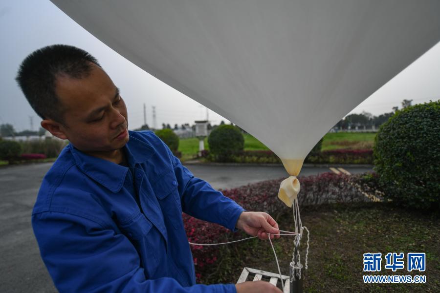 在成都温江国家气候观象台,气象观测工程师陈建将探空气球固定在放飞位置(3月16日摄)。新华社记者 王曦 摄