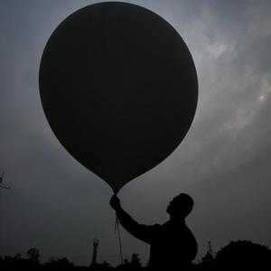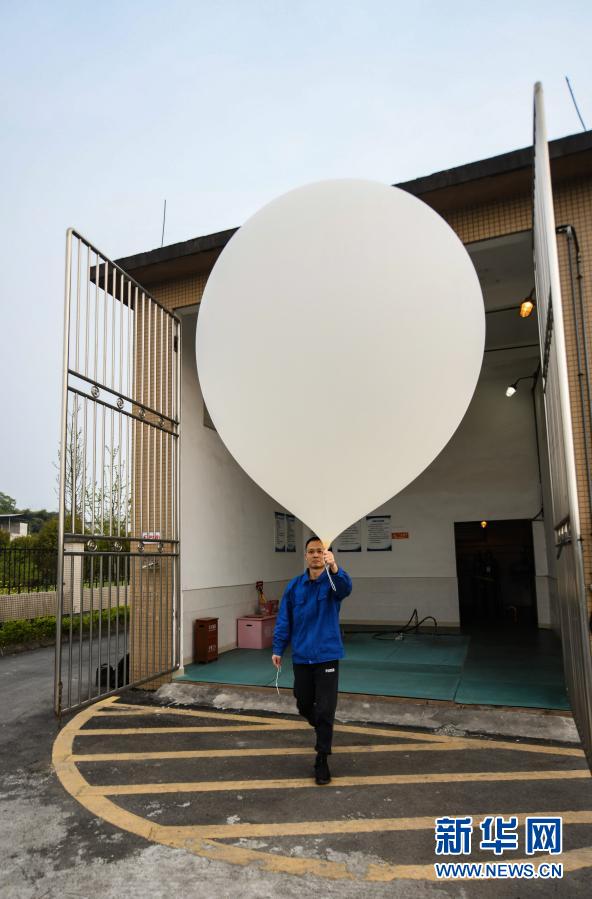 在成都温江国家气候观象台,气象观测工程师陈建将充好氢气的探空气球转移至预定放飞位置(3月16日摄)。新华社记者 王曦 摄