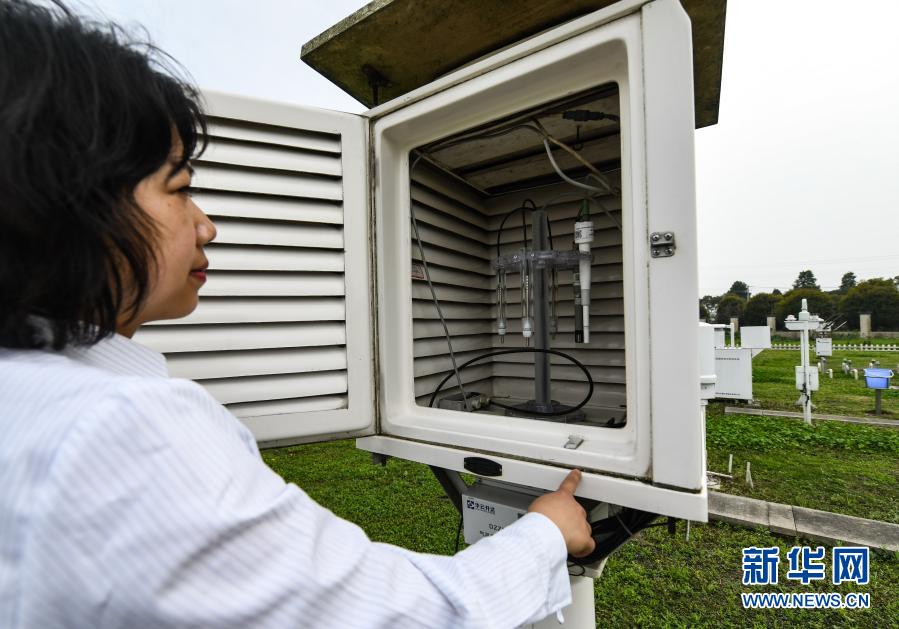 在成都温江国家气候观象台,温江区气象台基准站副站长陈乐检查气温多传感器标准控制器(3月16日摄)。新华社记者 王曦 摄