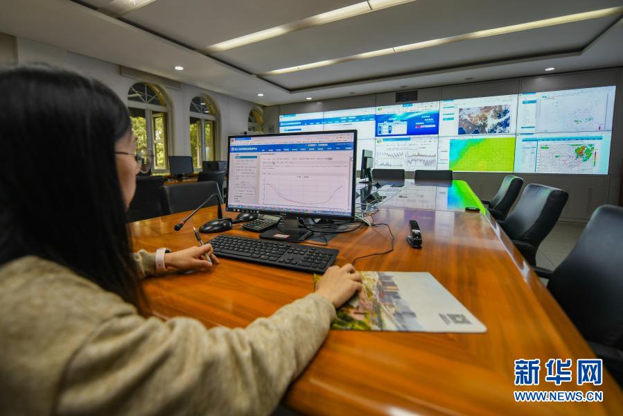 在成都温江区气象台,预报员刘智媛查看近期天气监测数据(3月16日摄)。新华社记者 王曦 摄