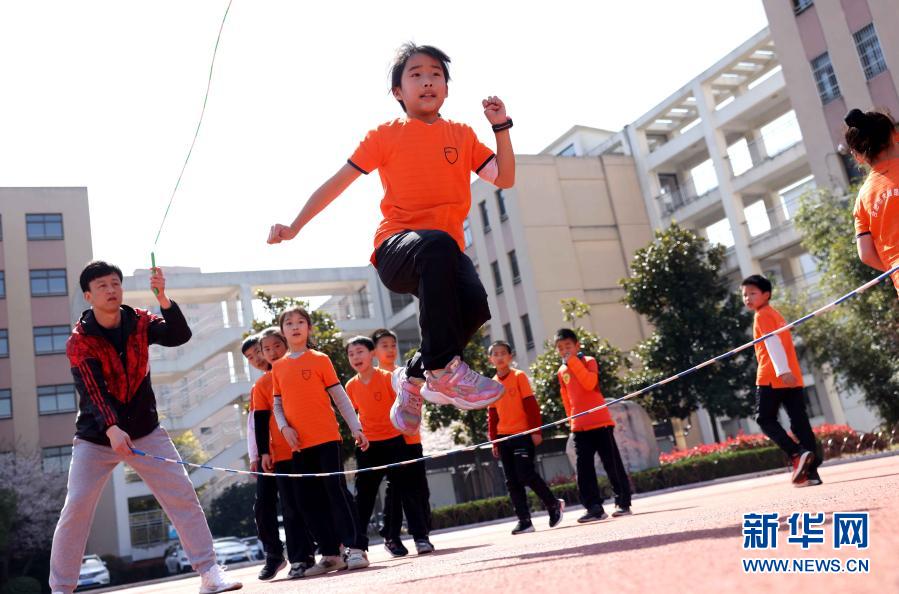 3月23日,在合肥市大通路小学新海校区,学生在大课间练习花样跳绳。