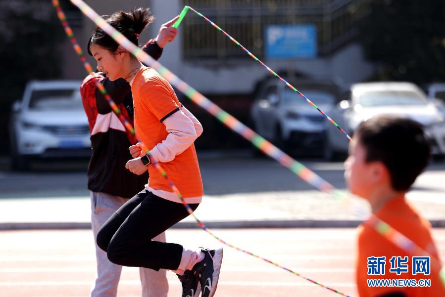 3月23日,在合肥市大通路小学新海校区,学生在大课间练习花样跳绳。