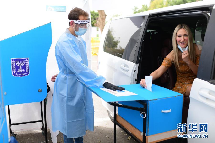 3月23日,在以色列中部城市特拉维夫一个为新冠疫情中的感染者或接受隔离人员设立的投票站,选民参加投票。