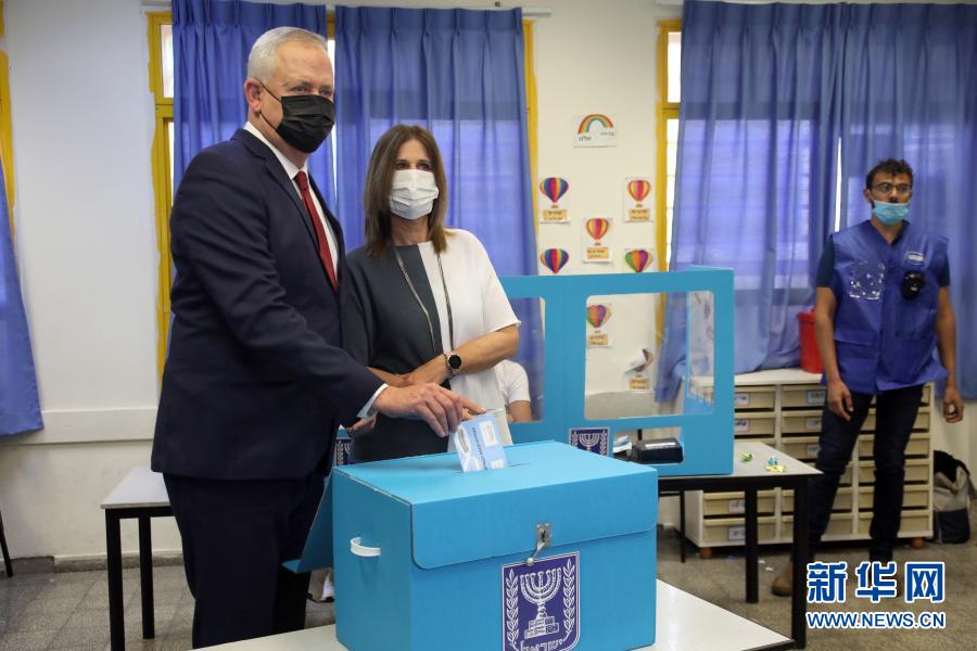 3月23日,以色列蓝白党领导人本尼·甘茨(左)在中部城市罗什艾因的一个投票站参加投票。