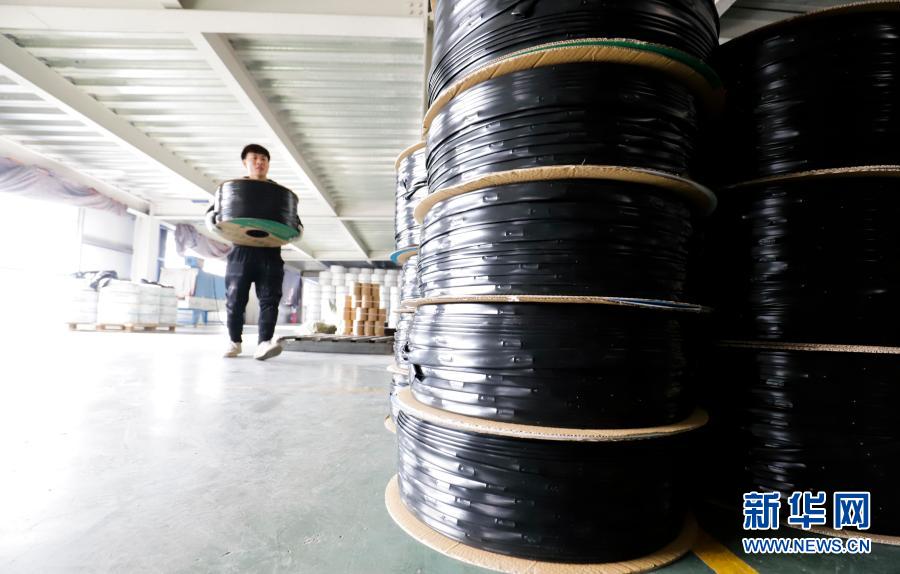 3月23日,在河北省玉田县的一家节水科技公司车间,工人在搬运农用滴灌带成品。