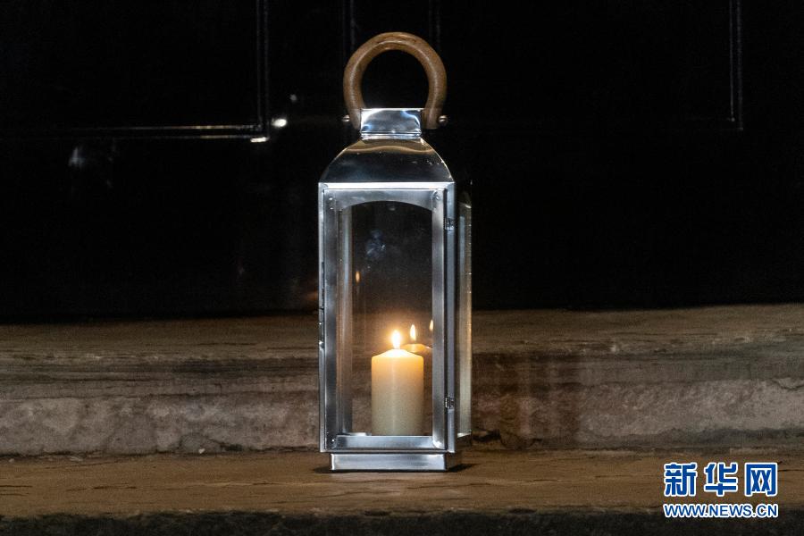 3月23日晚,一盏蜡烛灯摆放在英国伦敦唐宁街10号首相府门前。新华社发(雷伊·唐摄)