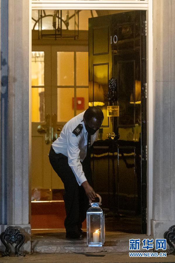 3月23日晚,工作人员在英国伦敦唐宁街10号首相府门前摆放一盏蜡烛灯。新华社发(雷伊·唐摄)