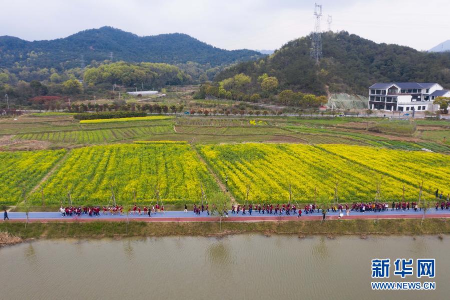 3月24日,春游的师生在诸暨市同山镇布布谷湖的环湖路上观赏春色(无人机照片)。