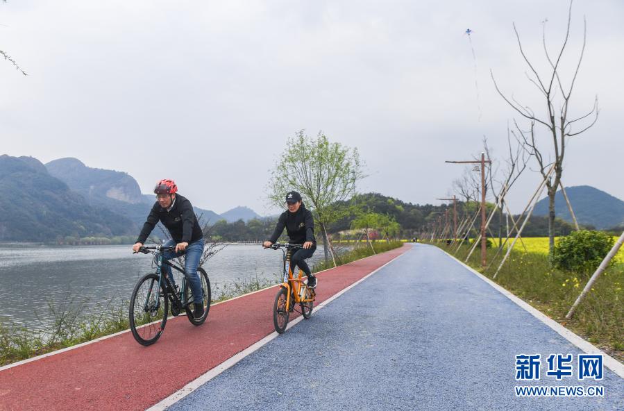 3月24日,游客在诸暨市同山镇布谷湖的环湖路上骑行。