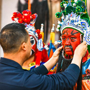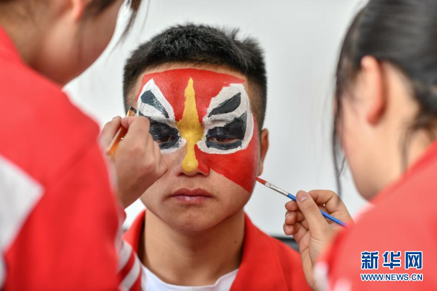 3月23日,贵州省龙里县第三中学学生在排练前画脸谱。