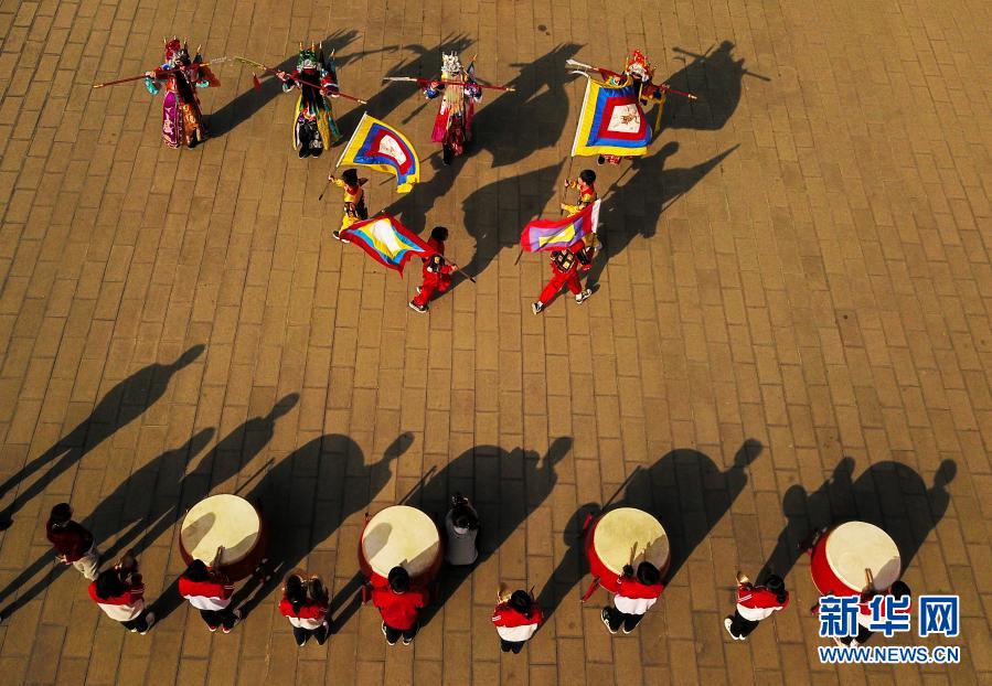 3月23日,贵州省龙里县第三中学师生在排练龙里太平花灯戏(无人机照片)。