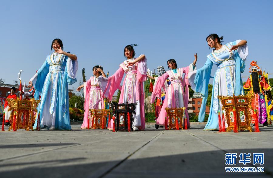 3月23日,贵州省龙里县第三中学师生在排练龙里太平花灯戏。