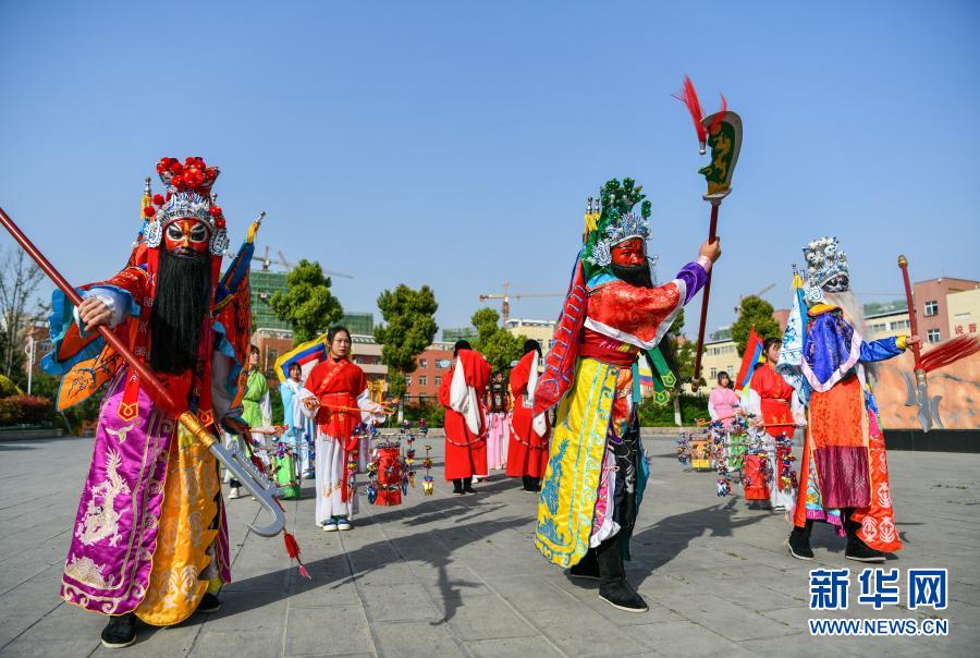 3月23日,贵州省龙里县第三中学师生在排练龙里太平花灯戏。