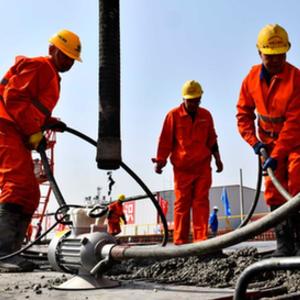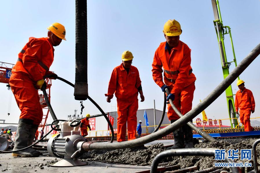3月24日,在潍烟高铁福山制梁场,中铁上海局的工人进行箱梁浇筑作业。