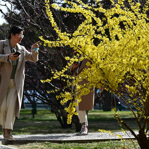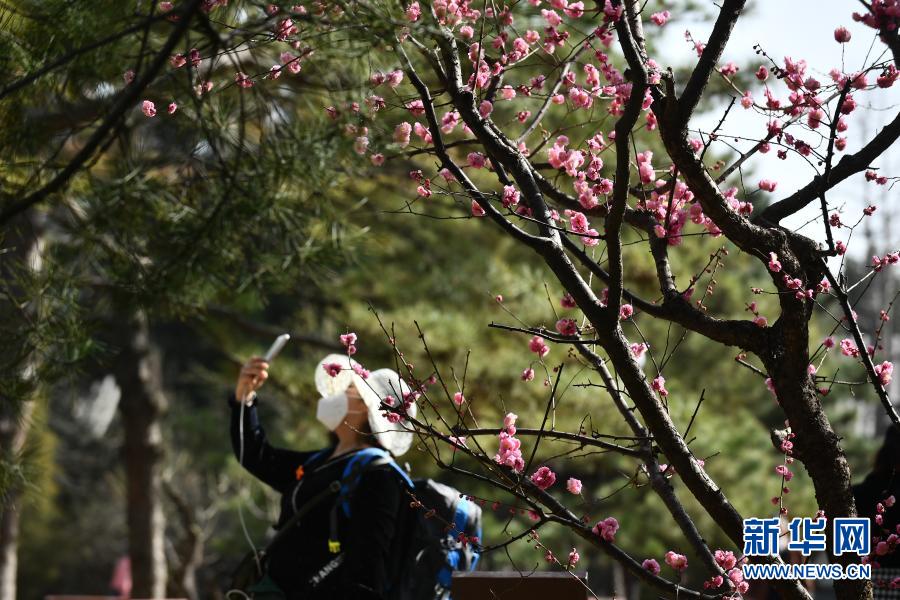 3月24日,游客在北京中山公园拍摄盛开的梅花。