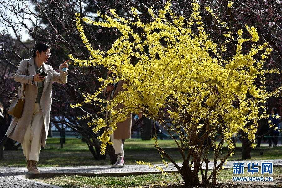 3月24日,游客在北京中山公园欣赏盛开的连翘。