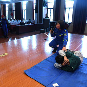 3月24日,合肥市蓝天救援队队员向学生示范急救方法。
