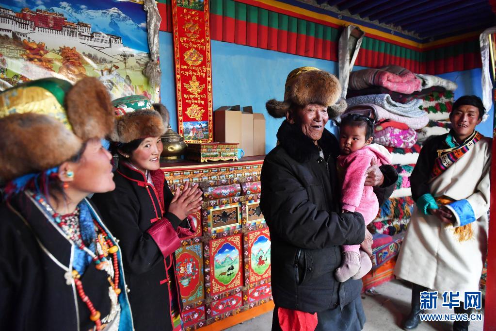巴桑(中)和家里人聊天(3月21日摄)。新华社记者 孙瑞博 摄
