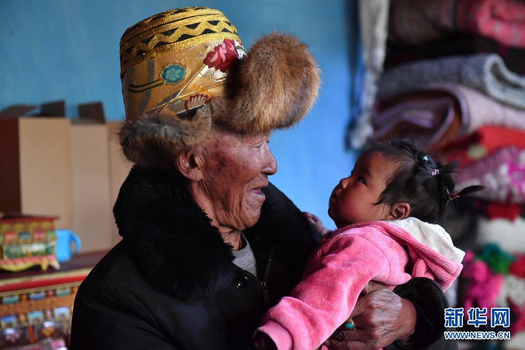 巴桑和九个月大的重外孙女白玛色珍在一起(3月21日摄)。新华社记者 孙瑞博 摄