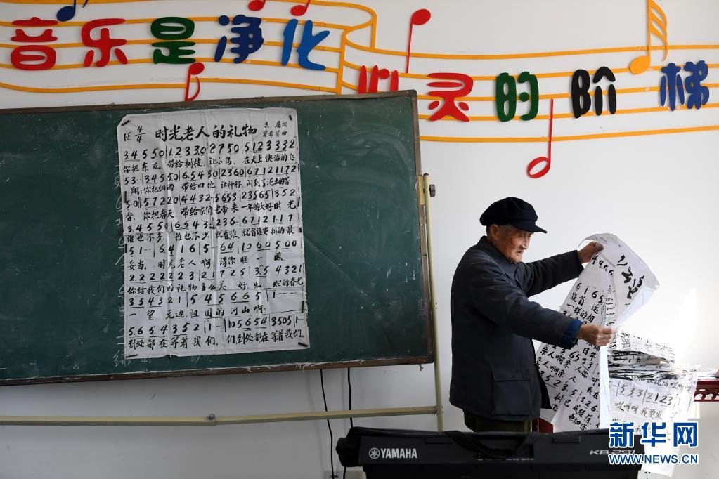 3月23日,严明友在朱湾小学音乐教室里整理自己手抄的歌谱。新华社记者 刘军喜 摄