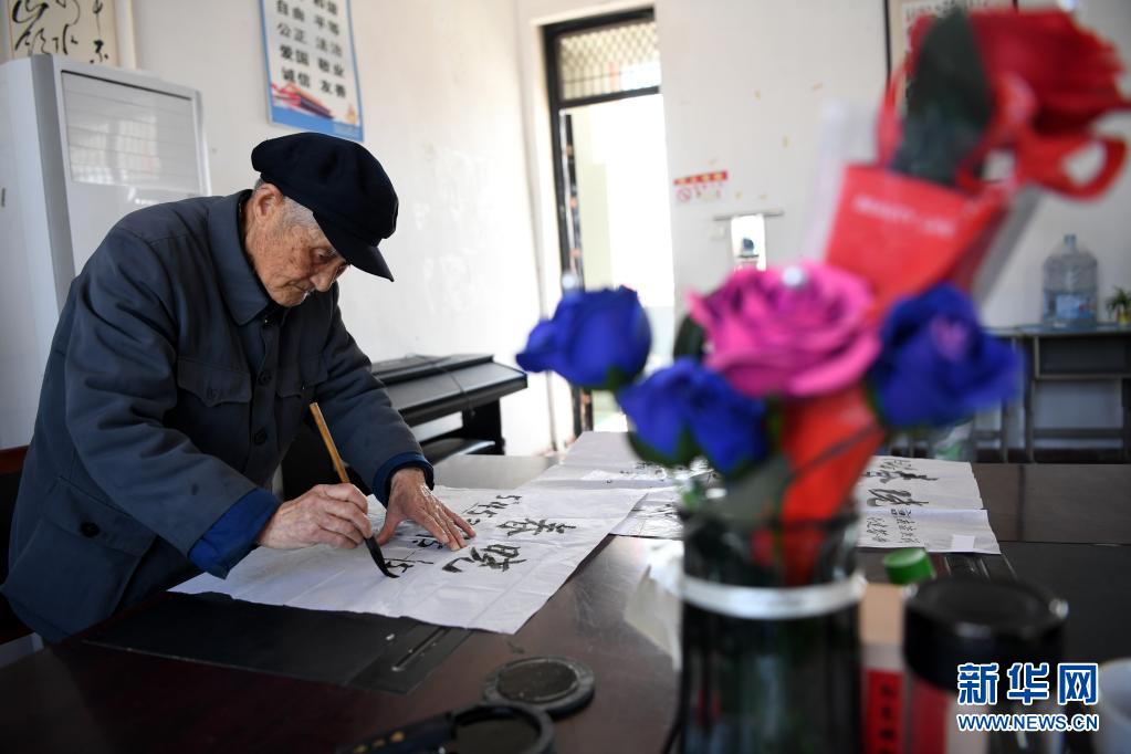 3月23日,严明友在朱湾小学办公室手抄歌谱。新华社记者 刘军喜 摄