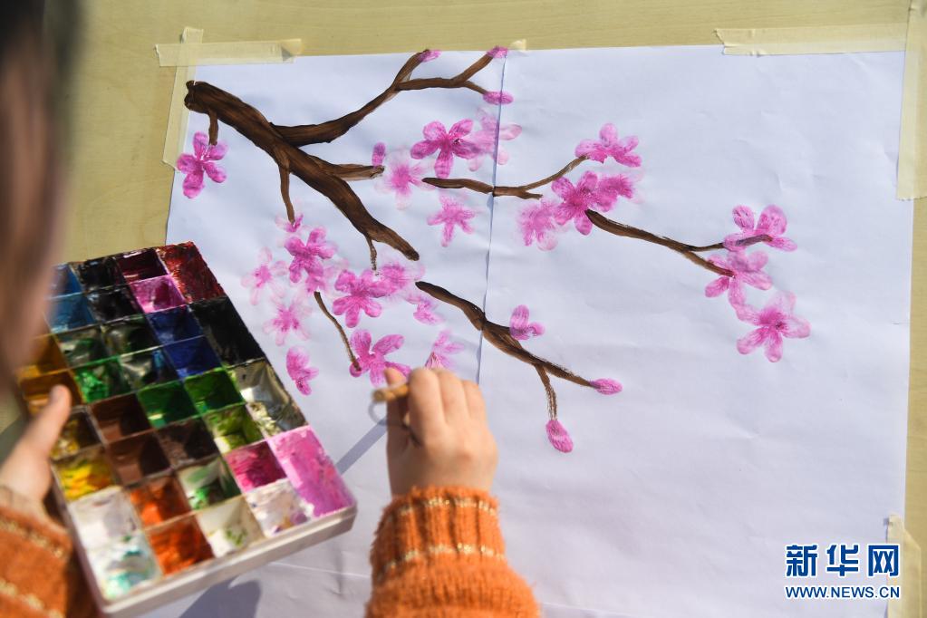 3月25日,一名农民画家在姚庄镇北鹤村的“浙北桃花岛”旅游区内采风。