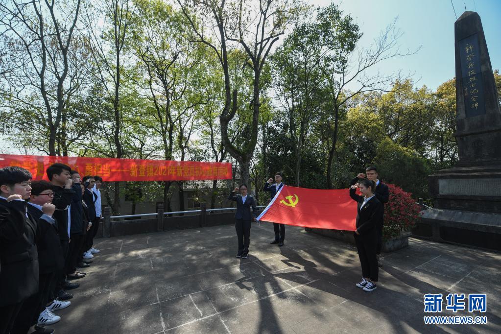 3月25日,新登镇新党员代表在塔山烈士陵园重温入党誓词。塔山烈士陵园沉眠了1945年在新登战役中牺牲的新四军烈士的忠魂遗骨。