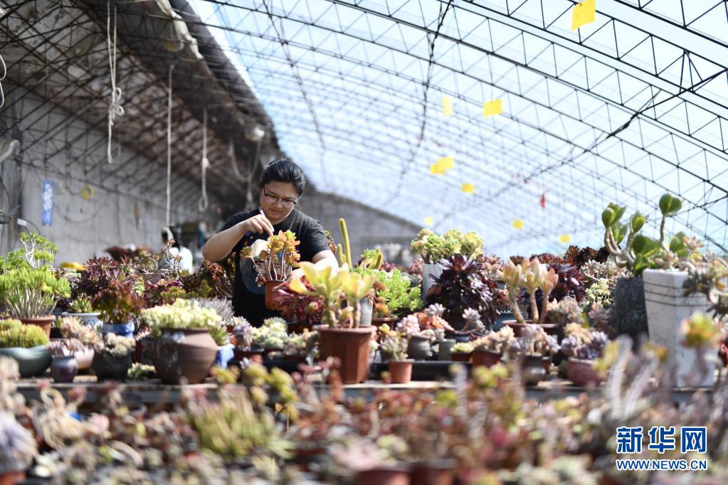 3月25日,河北省迁安市芦沟堡村村民在打理种植的多肉植物。
