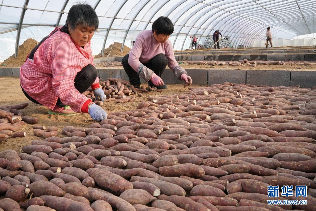 3月25日,河北省卢龙县木井镇一家红薯种植专业合作社社员在往苗床上摆放红薯种薯。