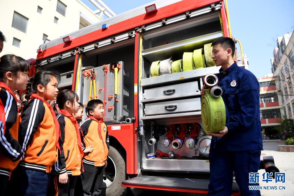 3月25日,合肥市包河区消防救援大队队员向孩子们介绍消防装备。