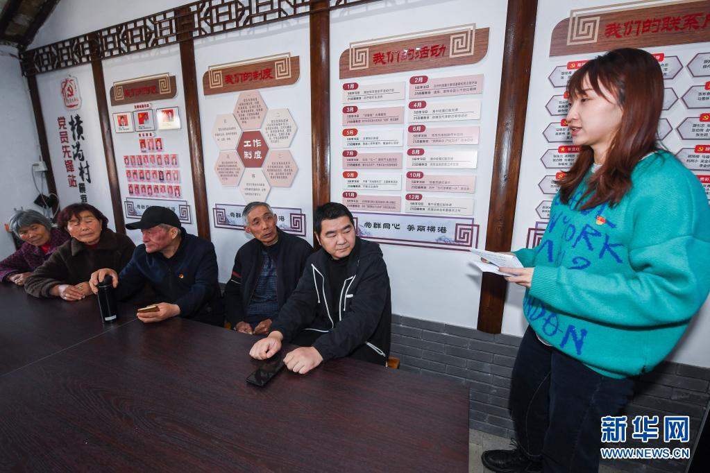 3月25日,青年宣讲团的吴婉涛(右一)在姚庄镇横港村党员先锋站开展党史宣讲,为村干部、老党员、村民讲述当地美丽乡村建设的最新成果。