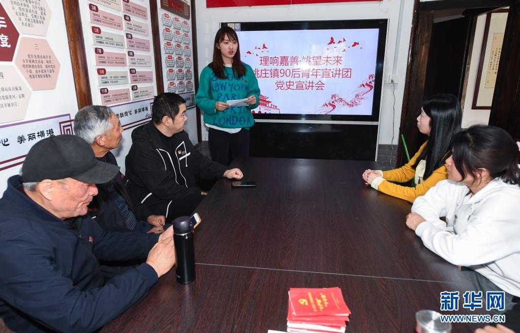 3月25日,青年宣讲团的吴婉涛(左四)在姚庄镇横港村党员先锋站开展党史宣讲,为村干部、老党员、村民讲述当地美丽乡村建设的最新成果。