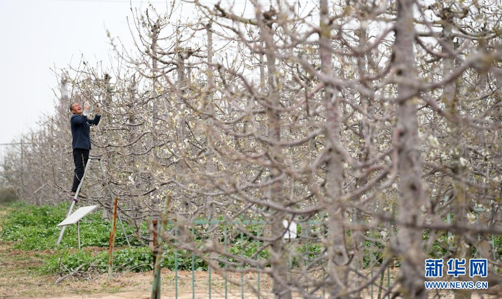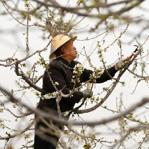 近日,随着气温逐渐上升,陕西省铜川市耀州区小丘镇果园里的樱桃花、桃花等渐次开放,果农们及时为果树除虫、修枝。