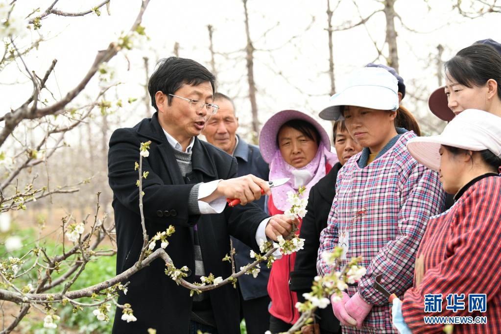 3月25日,西北农林科技大学园艺学院教授蔡宇良(左一)在铜川市耀州区小丘镇移寨村为果农讲解樱桃园春季管理注意事项。