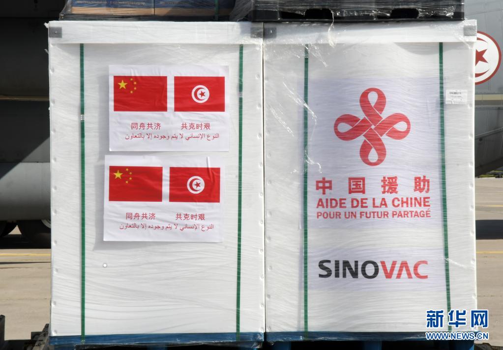 3月25日,在突尼斯迦太基国际机场,装有中国援助新冠疫苗的箱子上写有“同舟共济、共克时艰”的字样。