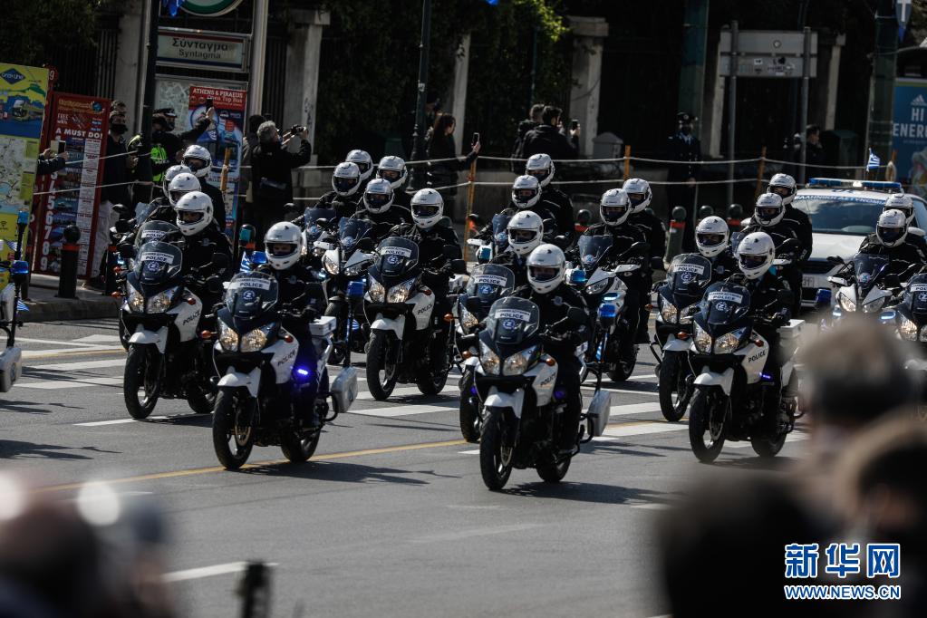 3月25日,警察摩托车队在希腊雅典参加阅兵仪式。