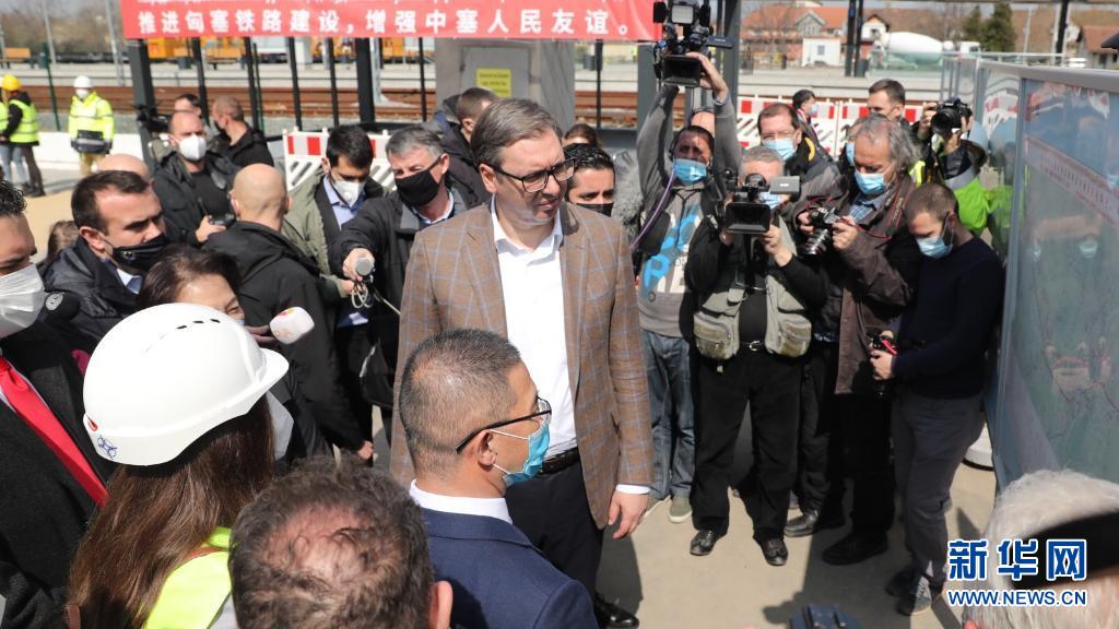 3月25日,塞尔维亚总统武契奇(中)在首都贝尔格莱德视察匈塞铁路项目建设情况。新华社发(王韡摄)