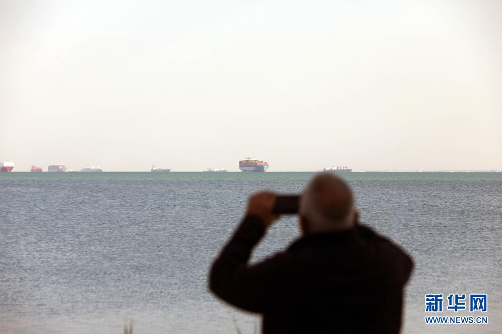3月25日,在埃及伊斯梅利亚省大苦湖,一名男子拍摄等待通过苏伊士运河的船只。新华社发(艾哈迈德·戈马摄)