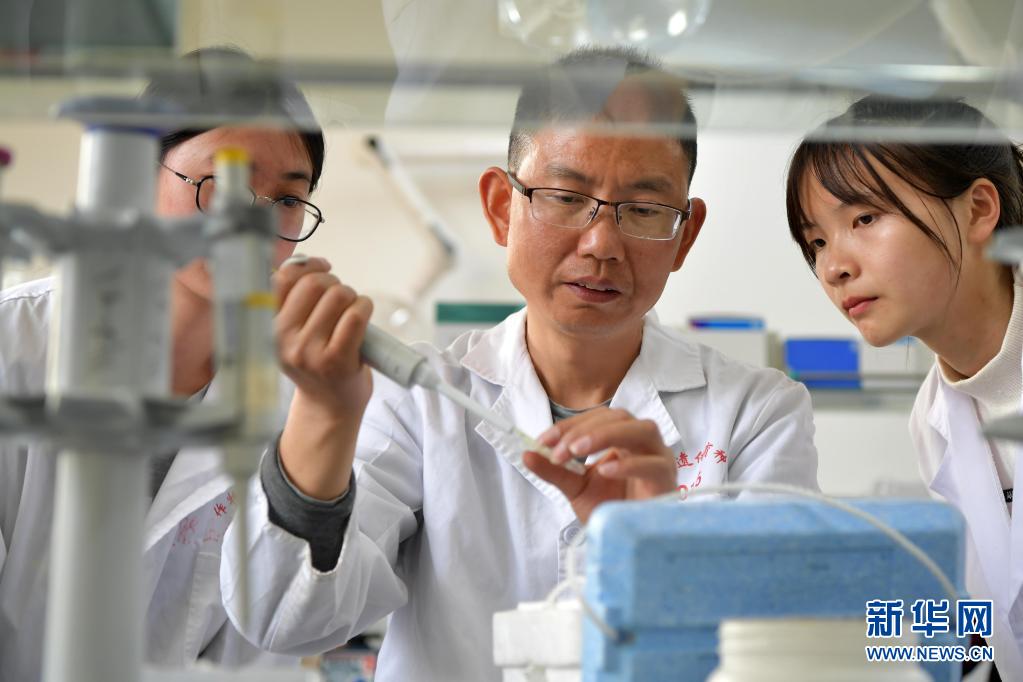 在江西农业大学的实验室,付东辉(中)在对彩色油菜花色素相关基因进行基因分型(3月24日摄)。新华社记者 彭昭之 摄