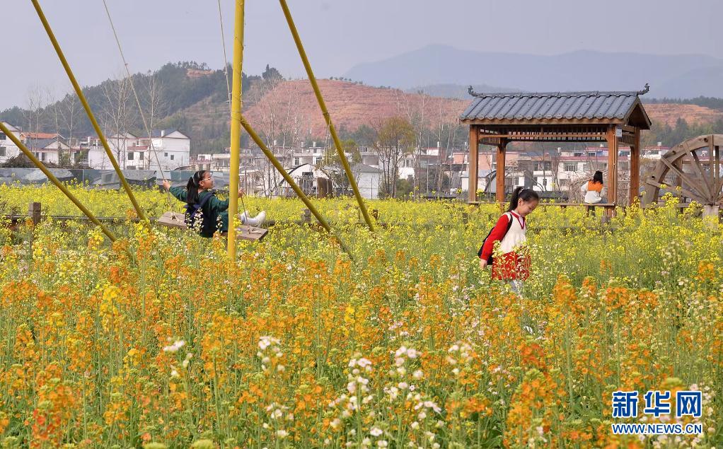 游客在位于江西省赣州市崇义县的冷杉影视基地的油菜花田里游玩,这里的油菜花就是付东辉团队培育的(资料照片)。新华社发
