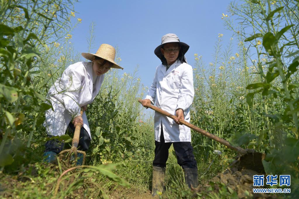 在江西农业大学的试验田里,付东辉(右)和学生在油菜田疏通水渠(3月24日摄)。新华社记者 彭昭之 摄