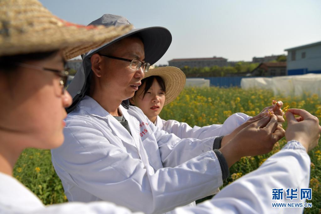 在江西农业大学的试验田里,付东辉(左二)和学生比对不同颜色的油菜花开出的花朵(3月24日摄)。新华社记者 彭昭之 摄