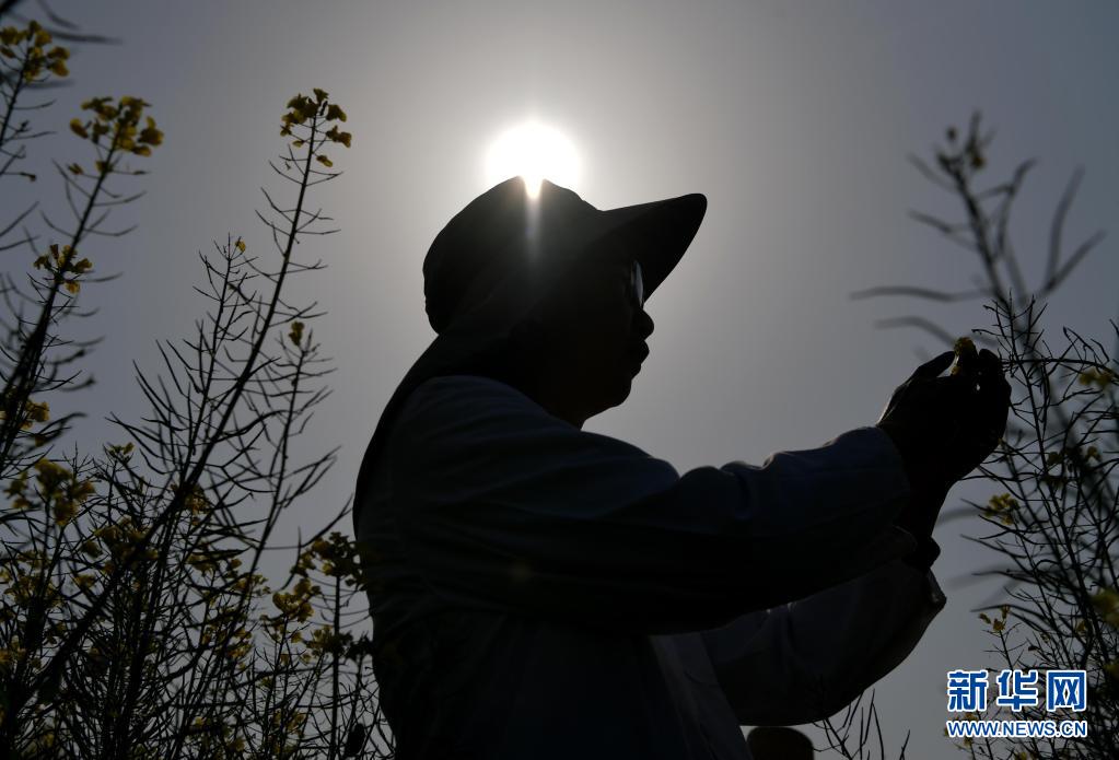 在江西农业大学的试验田里,付东辉查看油菜花开花的情况(3月24日摄)。新华社记者 彭昭之 摄