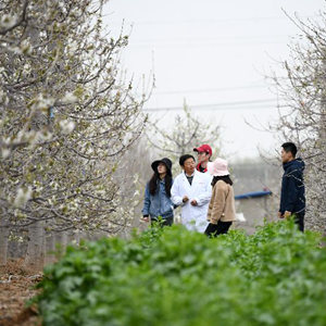 3月25日,西北农林科技大学园艺学院教授蔡宇良(左一)在铜川果树试验示范站为学生讲授樱桃园春季管理。