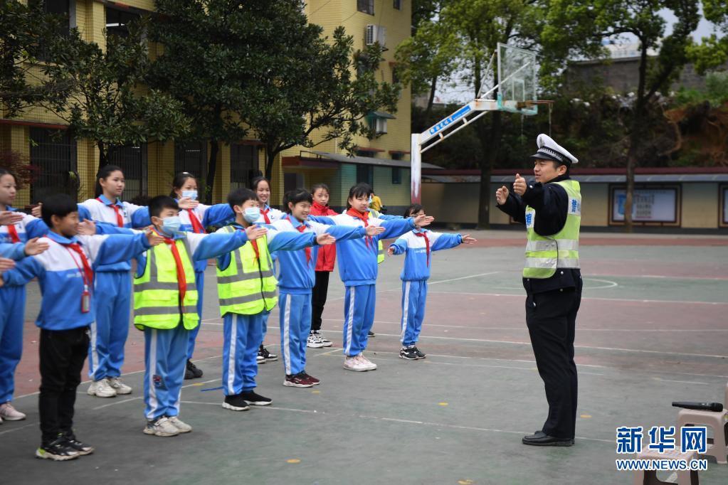 3月26日,长沙市望岳小学学生在操场学习交警手势。