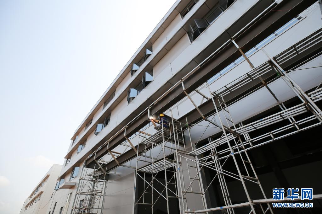 3月26日,工人在海口美兰空港一站式飞机维修基地项目现场施工。