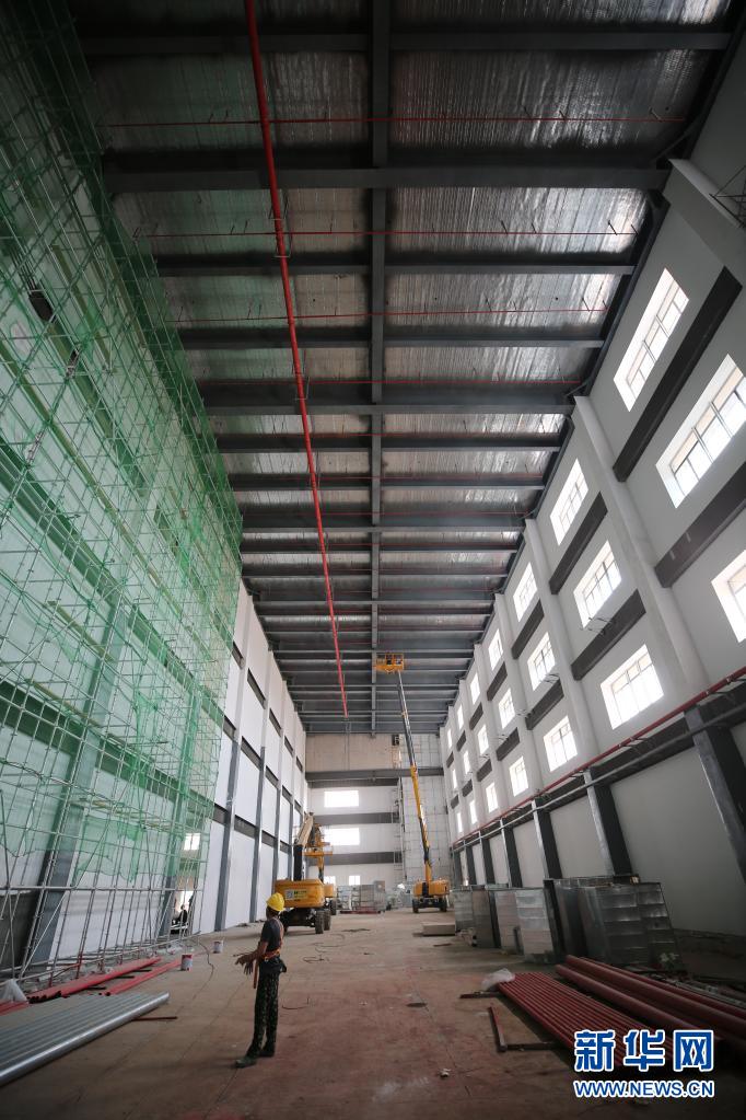 3月26日,工人在海口美兰空港一站式飞机维修基地项目现场施工。